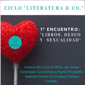 El viernes 30 de abril, abrirá el ciclo “Literatura & Co.”, una propuesta que busca vincular libros con temáticas de actualidad. La primera cita será sobre “Libros, deseo y erotismo”, una mesa en la que estarán las escritoras Marta D’Argüello y Anabella Franco junto a la sexóloga Fabiana Carballo.