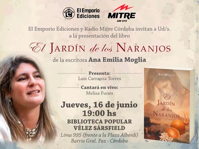 Por otra parte, también hoy a las 19 Ana Moglia presentará su novela «El jardín de los naranjos» acompañada de Luis Carranza Torres. La cita es en la Biblioteca Popular Vélez Sarsfield (Lima 995).
