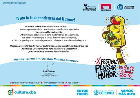 Bajo la consigna “¡Viva la independencia del humor!” este miércoles 1 de junio se realizará el lanzamiento del X Festival Pensar con Humor. La actividad será a las 16.30 en las instalaciones del Museo Marqués de Sobre Monte, oportunidad en la que se dará a conocer la grilla de actividades que se desplegará entre el 8 y el 12 de junio en toda la Provincia.