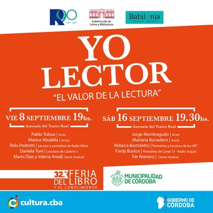 Como actividad principal de la semana, el jueves tendrá lugar la inauguración de la Feria del Libro y el Conocimiento de Córdoba 2017, que desplegará stands y una completa programación hasta el 24 de septiembre. Y en el marco de esta propuesta el viernes Babilonia Literaria presentará la intervención «Yo, Lector», en el Hall de entrada del Teatro Real, con la presencia de artistas y comunicadores de la ciudad.