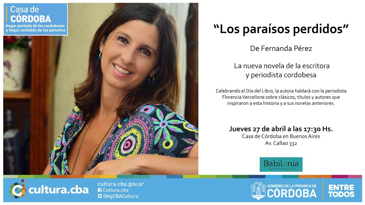 El jueves 27 de abril, a las 17.30, la escritora cordobesa Fernanda Pérez presentará su nueva novela “Los paraísos perdidos” en la Casa de Córdoba en Buenos Aires, espacio que funciona bajo la órbita del gobierno de la Provincia de Córdoba y que se encuentra en Callao 332.