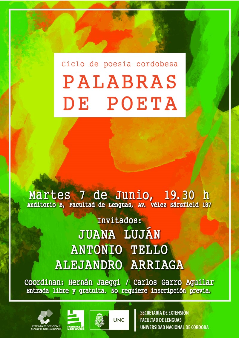 En esta oportunidad, estarán participando de la charla Juana Luján, Antonio Tello y Alejandra Arriaga. Recordemos que “Palabras de poeta” es una iniciativa que coordinan los poetas Hernán Jaeggi y Carlos Garro Aguilar. La cita es mañana a las 19.30 en el Auditorio de la Facultad de Lenguas (V. Sársfield 187), con entrada libre y gratuita.
