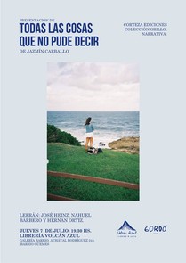 Y por último, el próximo jueves, en la previa de un fin de semana XXL, la librería Volcán Azul (dentro a la Galería Barrio, sobre Achaval Rodríguez del Paseo de las Artes), invita a la presentación del libro «Todas las cosas que no pude decir», de Jazmín Carballo, que tendrá lugar a las 19.30, con entrada libre y gratuita. Durante el encuentro, leerán textos de la escritora cordobesa José Heinz, Nahuel Barbero y Hernán Ortiz, ofreciendo a los presentes una introducción a la trama de este reciente material, publicado por Corteza Ediciones.