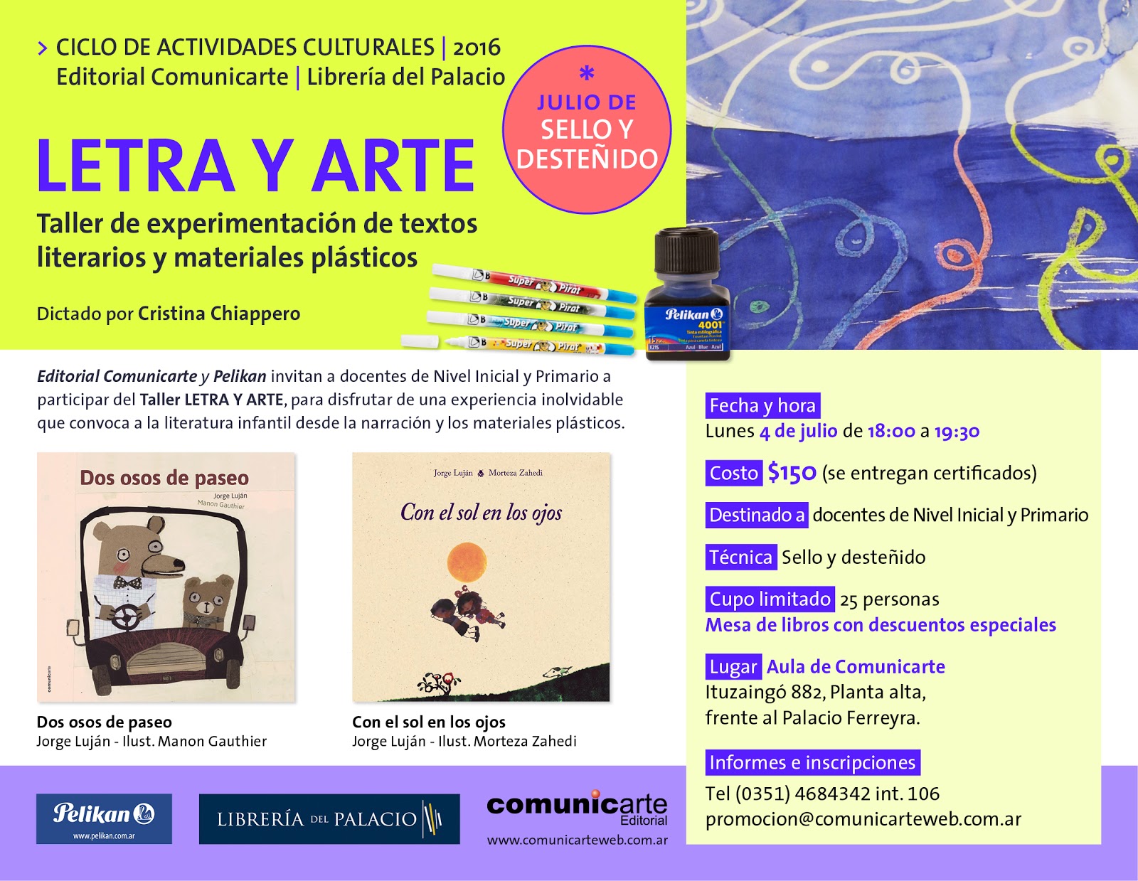 Se viene esta semana un nuevo encuentro de formación para docentes de la ciudad. Editorial Comunicarte y Pelikan invita a maestros del Nivel Inicial y Primario a participar del otra edición del taller “LETRA Y ARTE, julio de sello y desteñido”, que contará con la literatura infantil desde la narración y distintas técnicas plásticas, a cargo de Cristina Chiappero.