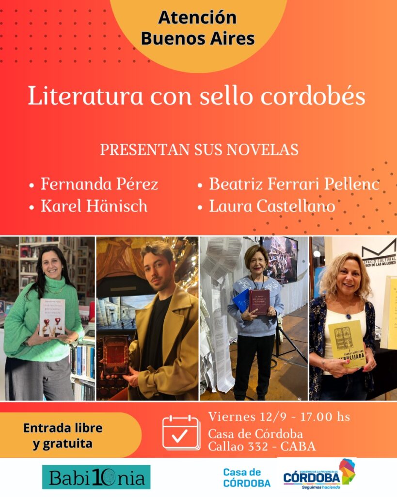 El foco estará puesto en los desafíos de escribir y publicar desde Córdoba, aunque los invitados se referirán también a sus últimas novelas. Karel Hänish ahondará sobre «La Pirouette del Búho Blanco», Beatriz Ferrari Pellenc sobre «Lo único que no cambia es el cielo» (que va ya por su segunda edición), y Laura Castellano a «Encrucijada».