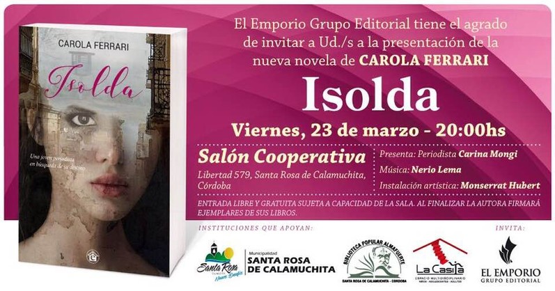 “Isolda” de Carola Ferrari se presentará esta noche a las 20 en el Salón Cooperativa de Santa Rosa de Calamuchita (Libertad 579). Acompañará a la autora la periodista Carina Mongi. Nerio Lema realizará el acompañamiento musical y habrá una intervención artística a cargo de Monserrat Hubert.