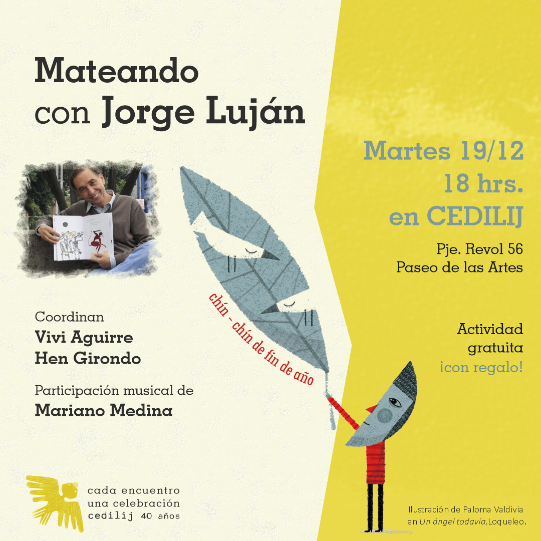 Mateando con Jorge Luján estará coordinado por Vivi Aguirre y Hen Girondo, y contará con la participación musical de Mariano Medina. Con entrada libre y gratuita, la cita es el próximo martes 19 de diciembre a las 18 hrs. en sede CEDILIJ. Con este evento, se cierra el programa de actividades 2023 y, especialmente, se celebra un año más de encuentro por los derechos de lxs niñxs a leer, decir e imaginar.