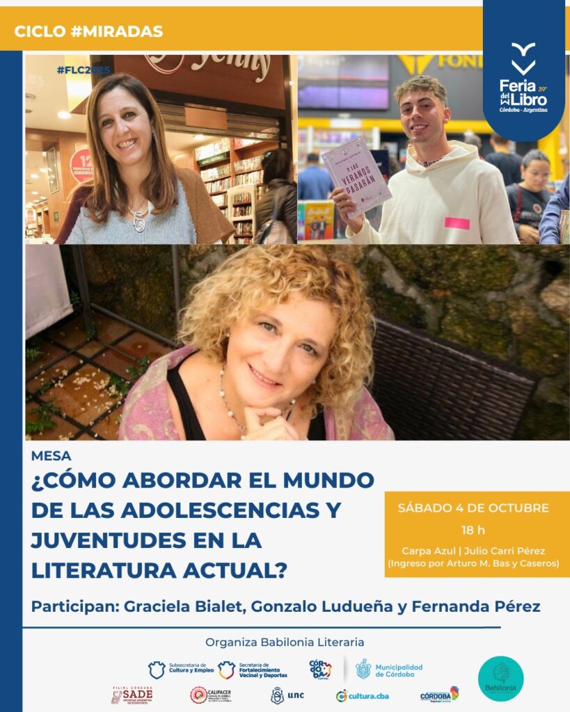 Los escritores cordobeses Gonzalo Ludueña, Graciela Bialet y Fernanda Pérez serán los protagonistas de la mesa “¿Cómo abordar el mundo de las adolescencias y juventudes en la literatura actual? que se llevará a cabo el sábado 4 de octubre a las 18 en la Carpa Azul (ingreso por Arturo M. Bas y Caseros) en el marco de la Feria del Libro de Córdoba.