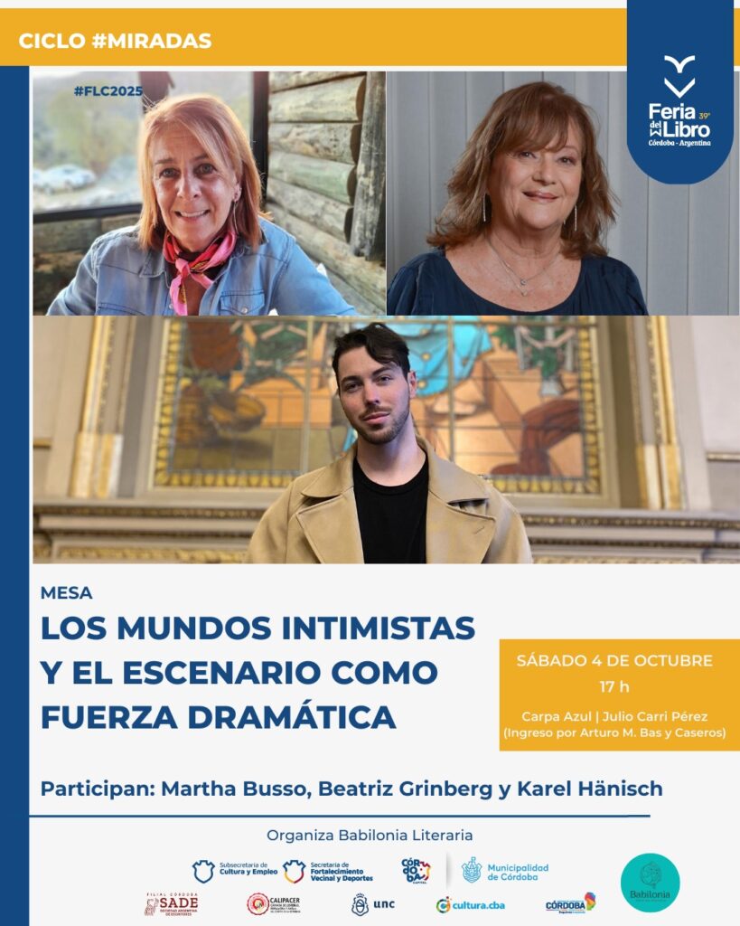 Los escritores cordobeses María Martha Busso, Beatriz Grinberg y Karel Hänisch abrirán el sábado 4 de octubre, a las 17, la primera mesa del ciclo que Babilonia realizará en el marco de la Feria del Libro Córdoba. La actividad será en la Carpa Azul (ingreso por Arturo M. Bas esquina Caseros).
